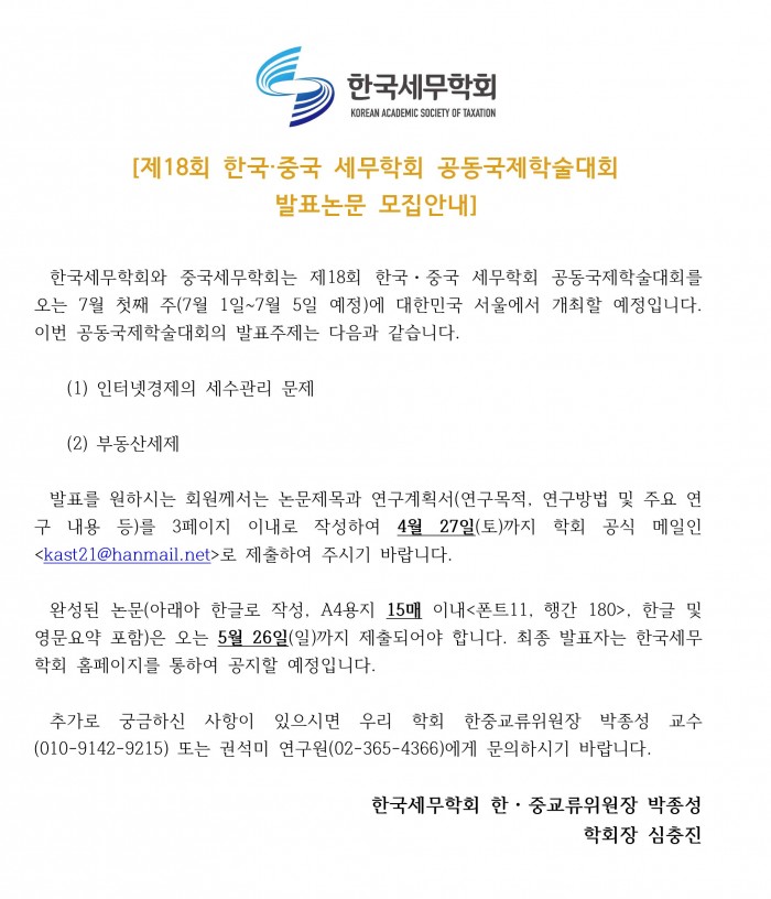 [한국세무학회]제18회 한국·중국 세무학회 공동국제학술대회 발표논문 모집안내
