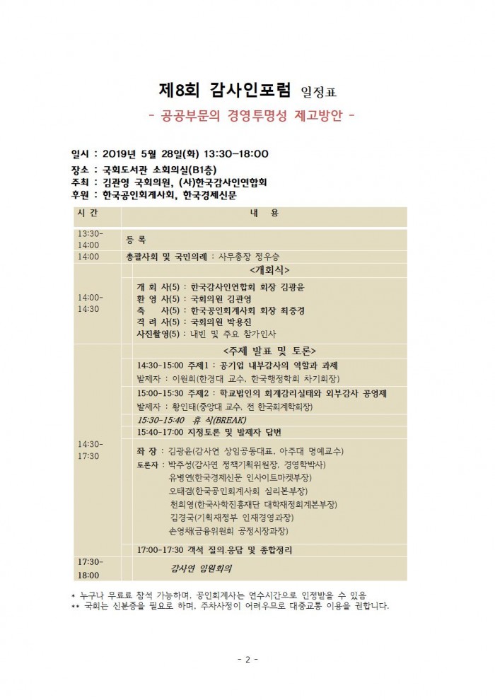 [(사)한국감사인연합회]제8회 감사인포럼 "공공부문의 경영투명성 제고방안" 개최안내