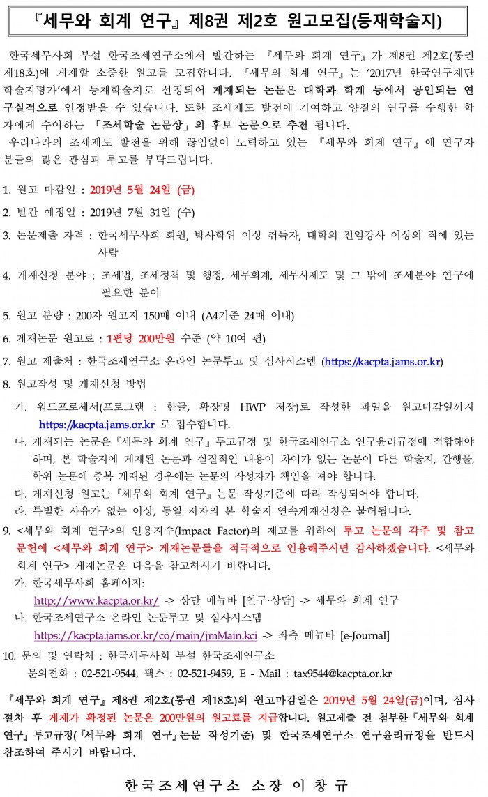 [공지][한국조세연구소]『세무와 회계 연구』 제8권 제2호 원고모집(등재학술지) 한국세무학회 0 11,107 2019.04.29 16:20 첨부파일 - 첨부파일: 한국조세연구소_연구윤리규정.pdf (250.6K) 0 2019-04-29 16:20:34 - 첨부파일: 한국조세연구소_투고규정.pdf (230.0K) 0 2019-04-29 16:20:34 목록 본문