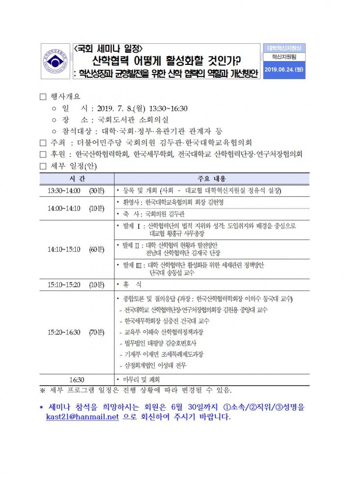 [공지][한국대학교육협의회]산학협력 어떻게 활성화할 것인가? : 혁신성장과 균형발전을 위한 산학 협력의 역할과 개선방안 세미나 안내 한국세무학회 0 8,056 2019.06.26 14:30 목록 본문 * 세미나 참석을 희망하시는 회원은 6월 30일까지 ①소속/②직위/③성명을 kast21@hanmail.net 으로 회신하여 주시기 바랍니다.