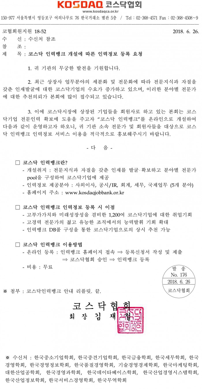 [공지][코스닥협회]코스닥인력뱅크 개설에 따른 인력정보 등록 요청 한국세무학회 0 14,616 2018.06.27 15:33 첨부파일 - 첨부파일: 첨부)코스닥인력뱅크 안내 리플릿.pdf (853.6K) 1 2018-06-27 15:33:21 목록 본문
