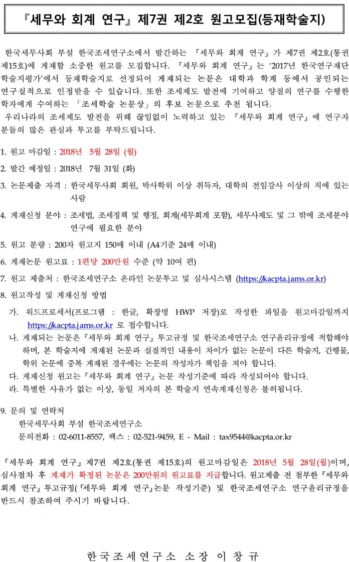 [공지][한국조세연구소]『세무와 회계 연구』 제7권 제2호 원고모집(등재학술지) 한국세무학회 0 14,525 2018.05.02 16:22 첨부파일 - 첨부파일: 한국조세연구소_연구윤리규정.pdf (250.6K) 1 2018-05-02 16:22:57 - 첨부파일: 한국조세연구소_투고규정.pdf (230.0K) 3 2018-05-02 16:22:57 목록 본문
