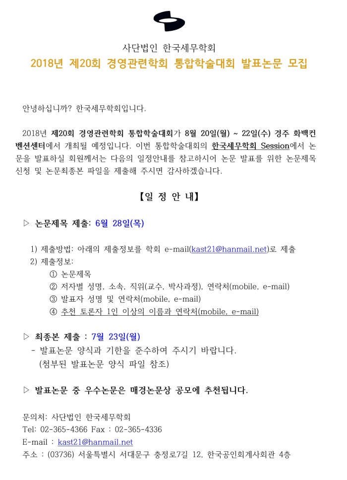 [공지][한국세무학회]2018년 제20회 경영관련학회 통합학술대회 발표논문 모집 한국세무학회 0 14,961 2018.06.07 16:53 첨부파일 - 첨부파일: 첨부2. 발표논문 양식.hwp (21.5K) 1 2018-06-07 16:53:58 목록 본문