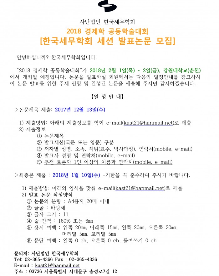 [한국세무학회]2018 경제학공동학술대회 한국세무학회 세션 발표논문 모집