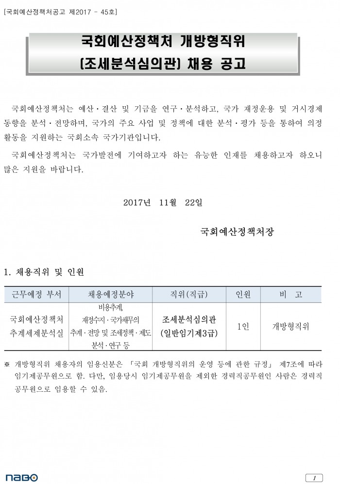 [공지][국회예산정책처] 개방형직위 조세분석심의관 채용 공고 한국세무학회 0 14,291 2017.11.29 11:49 첨부파일 - 첨부파일: 국회예산정책처_개방형직위(조세분석심의관)_채용_공고.hwp (72.5K) 1 2017-11-29 11:49:40 목록 본문