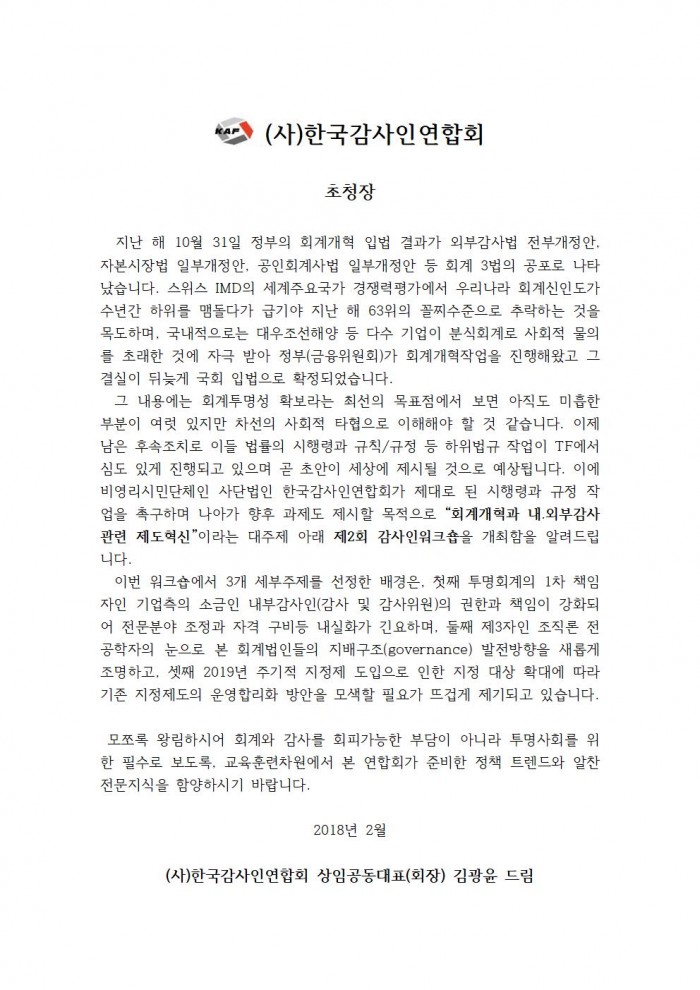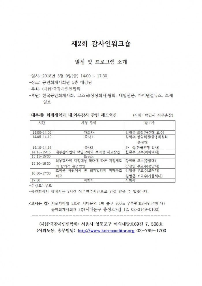 [(사)한국감사인연합회] 제2회 감사인워크숍 개최공지