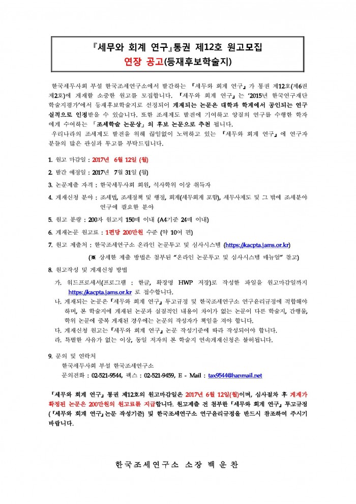 [공지][한국조세연구소] '세무와 회계 연구' 제12호 논문 연장 접수 안내 한국세무학회 0 12,399 2017.05.25 14:11 첨부파일 - 첨부파일: 한국조세연구소_투고규정.pdf (230.0K) 4 2017-05-25 14:12:07 - 첨부파일: 한국조세연구소_연구윤리규정.pdf (250.6K) 0 2017-05-25 14:12:19 목록 본문