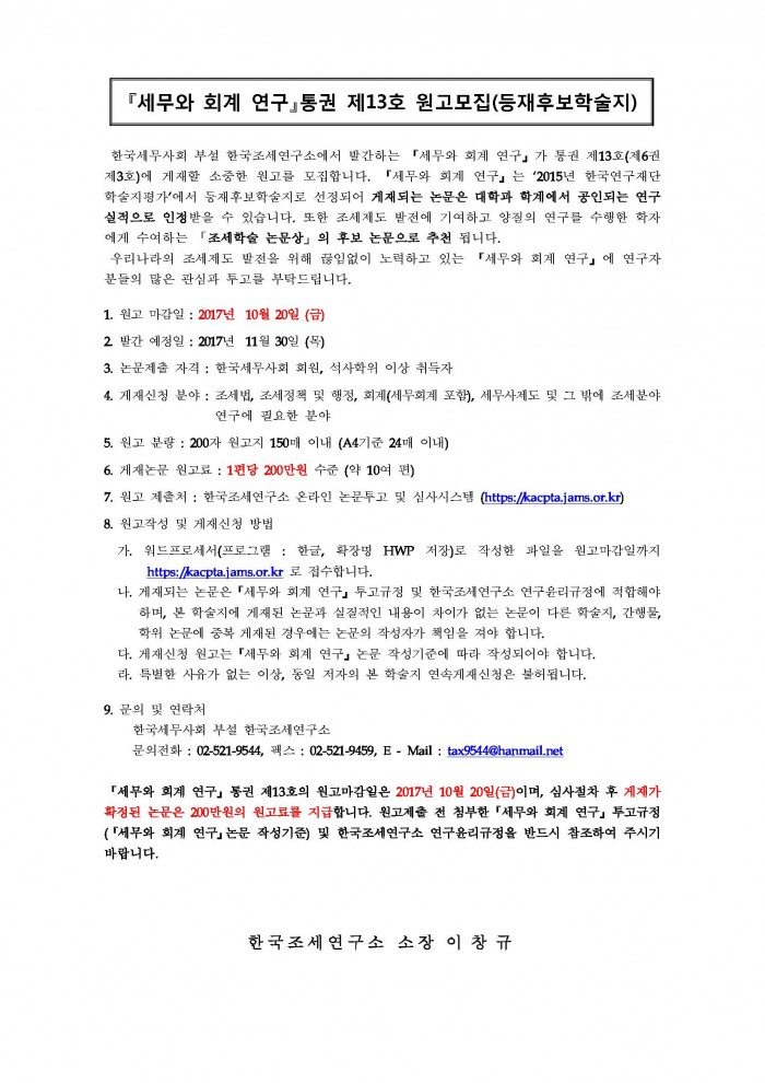 [공지][한국조세연구소] 『세무와 회계 연구』통권 제13호 원고모집(등재후보학술지) 한국세무학회 0 12,775 2017.08.21 11:28 첨부파일 - 첨부파일: 한국조세연구소_연구윤리규정.pdf (250.6K) 2 2017-08-21 11:28:37 - 첨부파일: 한국조세연구소_투고규정.pdf (230.0K) 1 2017-08-21 11:28:37 목록 본문
