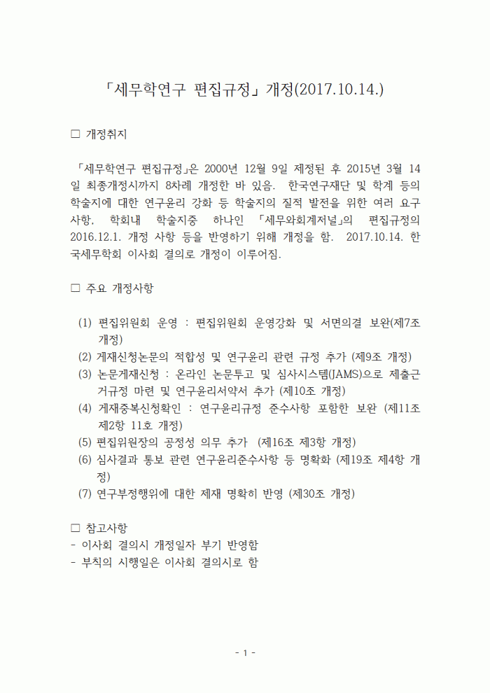 [공지]「세무학연구 편집규정」 개정(2017.10.14.) 한국세무학회 0 14,021 2017.10.19 14:23 첨부파일 - 첨부파일: 세무학연구 편집규정 개정취지-20171014.pdf (76.8K) 1 2017-10-19 14:23:39 - 첨부파일: 사단법인한국세무학회세무학연구편집규정(2017년10월14일개정)-수정사항표시.pdf (126.3K) 1 2017-10-19 14:23:39 목록 본문