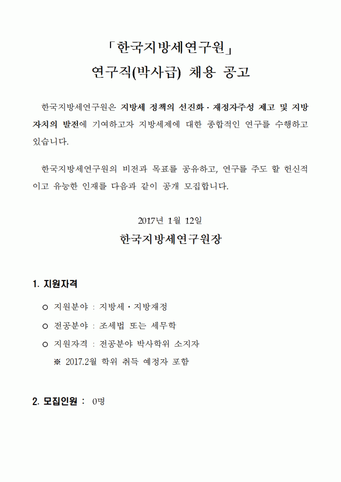[공지][한국지방세연구원] 연구직(박사급) 채용 공고 한국세무학회 0 13,955 2017.01.13 11:29 첨부파일 - 첨부파일: 공고문.hwp (16.5K) 1 2017-01-13 11:29:13 - 첨부파일: 지원서 양식.hwp (29.5K) 0 2017-01-13 11:29:13 목록 본문