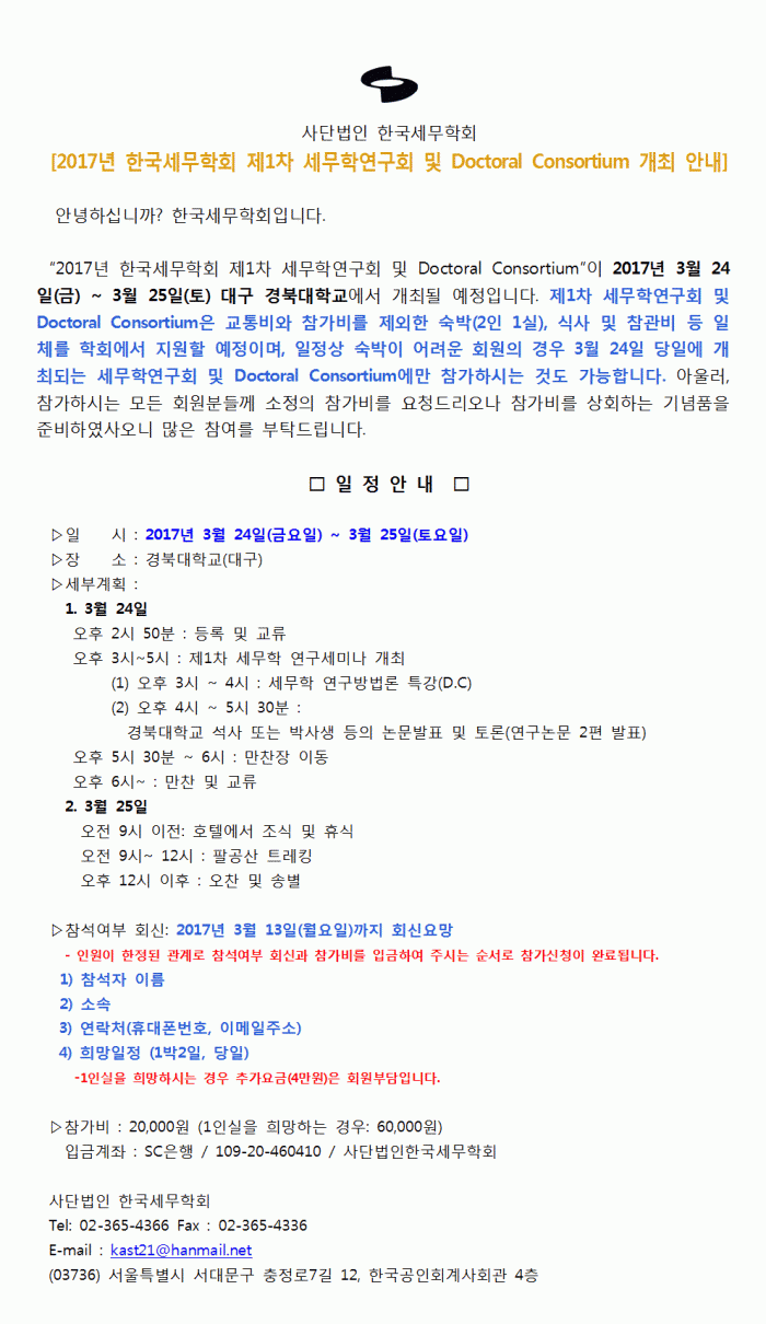 [한국세무학회] 2017년 한국세무학회 제1차 세무학연구회 개최공지(3/24~25, 경북대)