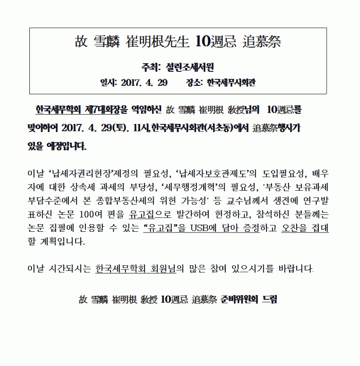 [한국세무학회] 최명근 제7대회장 10주기 추모제 안내