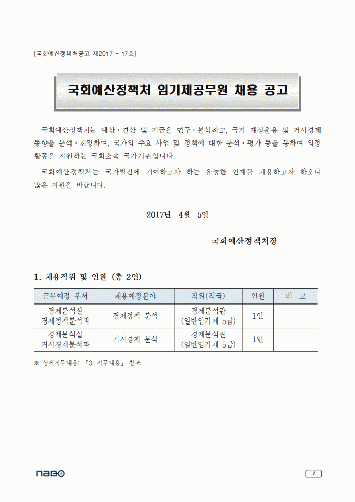 [공지][국회예산정책처] 임기제공무원 채용 공고 한국세무학회 0 14,626 2017.04.10 14:16 첨부파일 - 첨부파일: 국회예산정책처임기제공무원(경제분석관)채용공고.hwp (74.0K) 3 2017-04-10 14:16:26 목록 본문 *첨부문서를 참고하여 주시기 바랍니다.