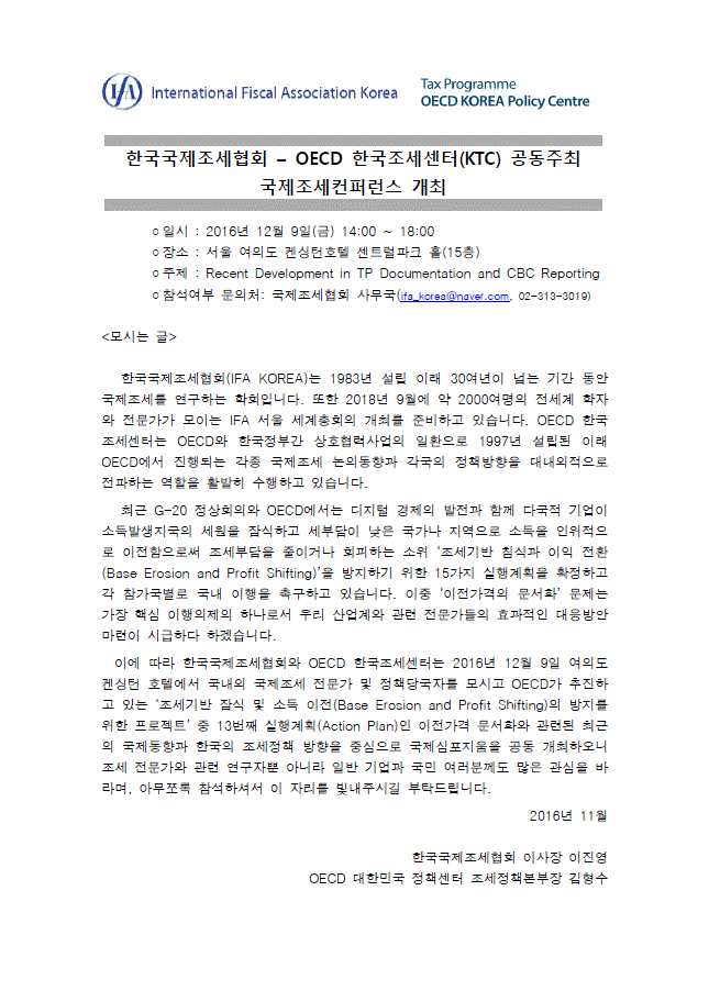 [공지][한국국제조세협회/OECD한국조세센터] 국제조세컨퍼런스 개최안내 한국세무학회 0 14,034 2016.11.29 14:51 첨부파일 - 첨부파일: IFA Korea_OECD정책센터_공동Conference 초청장.pdf (353.2K) 0 2016-11-29 14:51:24 목록 본문