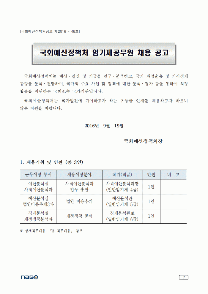 [공지][국회예산정책처] 임기제공무원 채용공고 한국세무학회 0 12,377 2016.09.21 13:50 첨부파일 - 첨부파일: 국회예산정책처 임기제공무원 채용 공고.hwp (113.5K) 2 2016-09-21 13:50:22 목록 본문