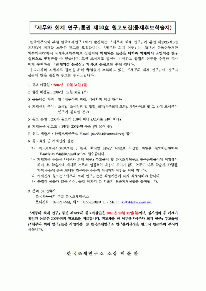 [공지][한국조세연구소] 학술지『세무와 회계 연구』통권 제10호 원고모집(등재후보학술지) 한국세무학회 0 13,662 2016.09.22 15:19 첨부파일 - 첨부파일: 한국조세연구소_연구윤리규정.pdf (250.6K) 1 2016-09-22 15:19:22 - 첨부파일: 한국조세연구소_투고규정.pdf (230.0K) 2 2016-09-22 15:19:22 목록 본문