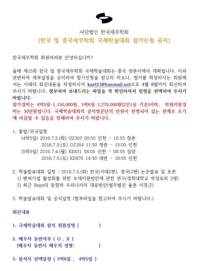 [공지][한국세무학회] 한국 및 중국세무학회 국제학술대회 참가신청 공지 한국세무학회 0 12,601 2016.04.04 12:13 첨부파일 - 첨부파일: 한중국제학술대회 일정(160325).pdf (101.2K) 7 2016-04-04 12:13:08 목록 본문