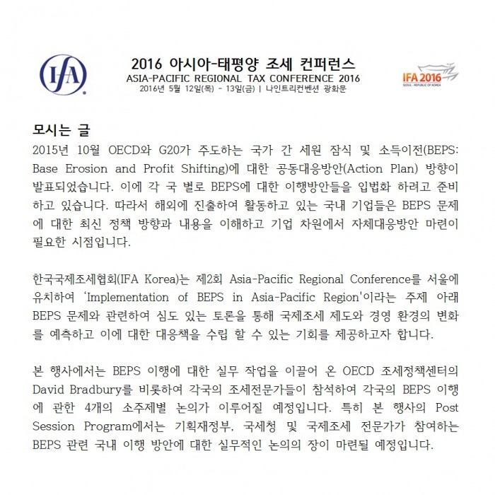 [공지][한국국제조세협회]2016 아시아-태평양 조세 컨퍼런스(5/12~5/13) 한국세무학회 0 12,892 2016.05.11 12:03 첨부파일 - 첨부파일: IFA2016첨부자료.hwp (48.0K) 2 2016-05-11 12:03:01 목록 본문 *컨퍼런스 개요 및 프로그램은 첨부파일을 참고하여 주시기 바랍니다.