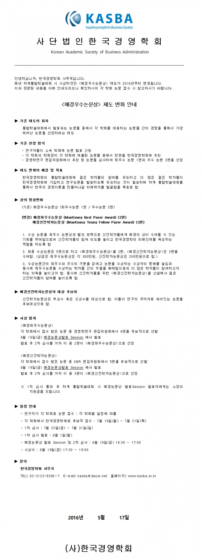 [한국경영학회] <매경우수논문상> 제도 변경 안내