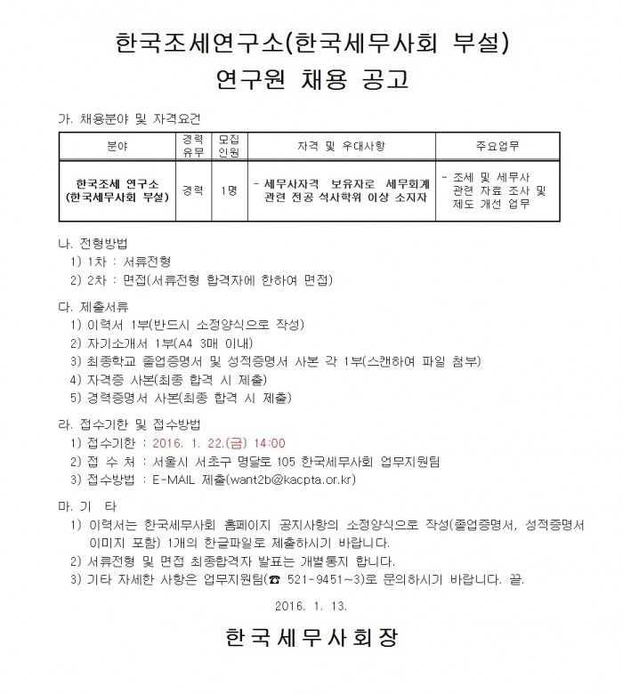 [공지][한국조세연구소] 연구원 채용 공고 한국세무학회 0 13,040 2016.01.19 11:12 첨부파일 - 첨부파일: [한국세무사회]이력서 및 자기소개서(응시자 성명).hwp (32.0K) 0 2016-01-19 11:12:38 목록 본문
