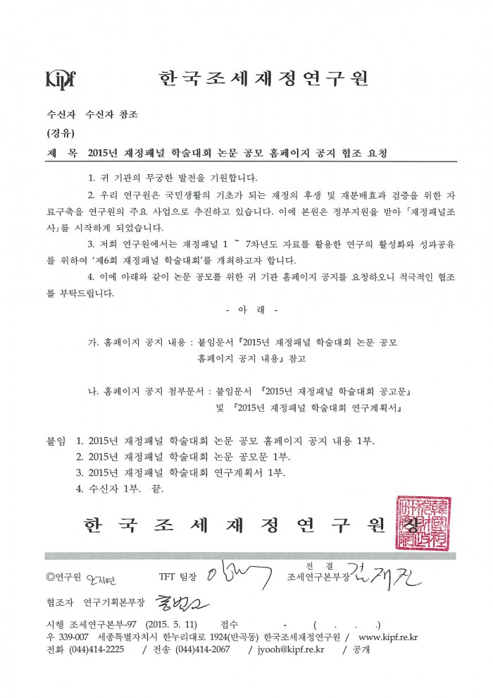 [공지][한국조세재정연구원]2015년 재정패널 학술대회 논문 공모 한국세무학회 0 16,933 2015.05.15 10:28 첨부파일 - 첨부파일: 붙임파일.hwp (1.5M) 5 2015-05-15 10:32:37 목록 본문