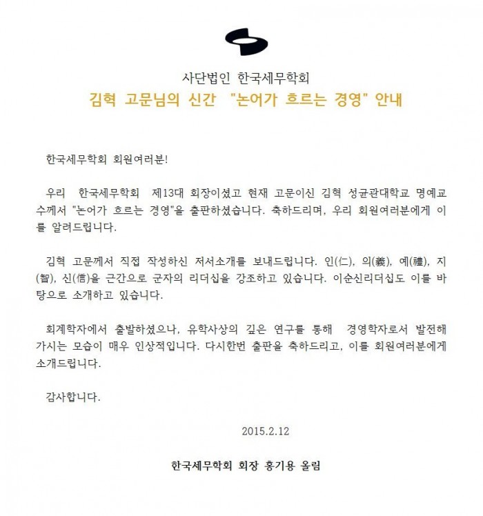 [공지][한국세무학회]김혁 고문님의 신간 "논어가 흐르는 경영" 안내 한국세무학회 0 17,590 2015.02.12 16:25 첨부파일 - 첨부파일: 논어경영_김혁고문님.pdf (55.1K) 0 2015-02-12 16:27:14 목록 본문