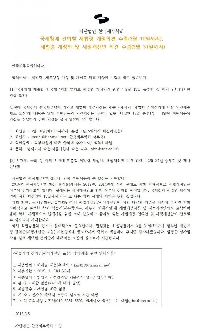 [공지][한국세무학회]국세청에 건의할 세법령 개정의견 수렴(3월 10일까지), 세법령 개정안 및 세정개선안 의견 수렴(3월 31일까지… 한국세무학회 0 15,386 2015.03.05 12:40 첨부파일 - 첨부파일: 첨부1-세법령건의사항-국세청제출용(3월10일까지).hwp (16.0K) 1 2015-03-05 12:40:58 - 첨부파일: 첨부2-개정건의안(3월31일까지).hwp (16.0K) 0 2015-03-05 12:40:58 목록 본문