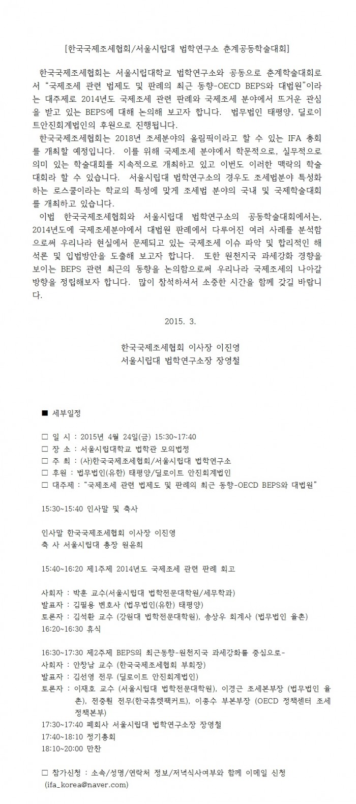 [공지][한국국제조세협회/서울시립대 법학연구소]춘계공동학술대회 개최 공지 한국세무학회 0 27,986 2015.04.21 18:06 목록 본문 문의사항.김연 연구원- Tel. 02-313-3019 / Mobile. 010 - 4913 - 0317- 서울시 서대문구 충정로 7길 12 (충정로2가) 한국공인회계사회관 3층 (120-012)- http://www.ifakorea.org/
