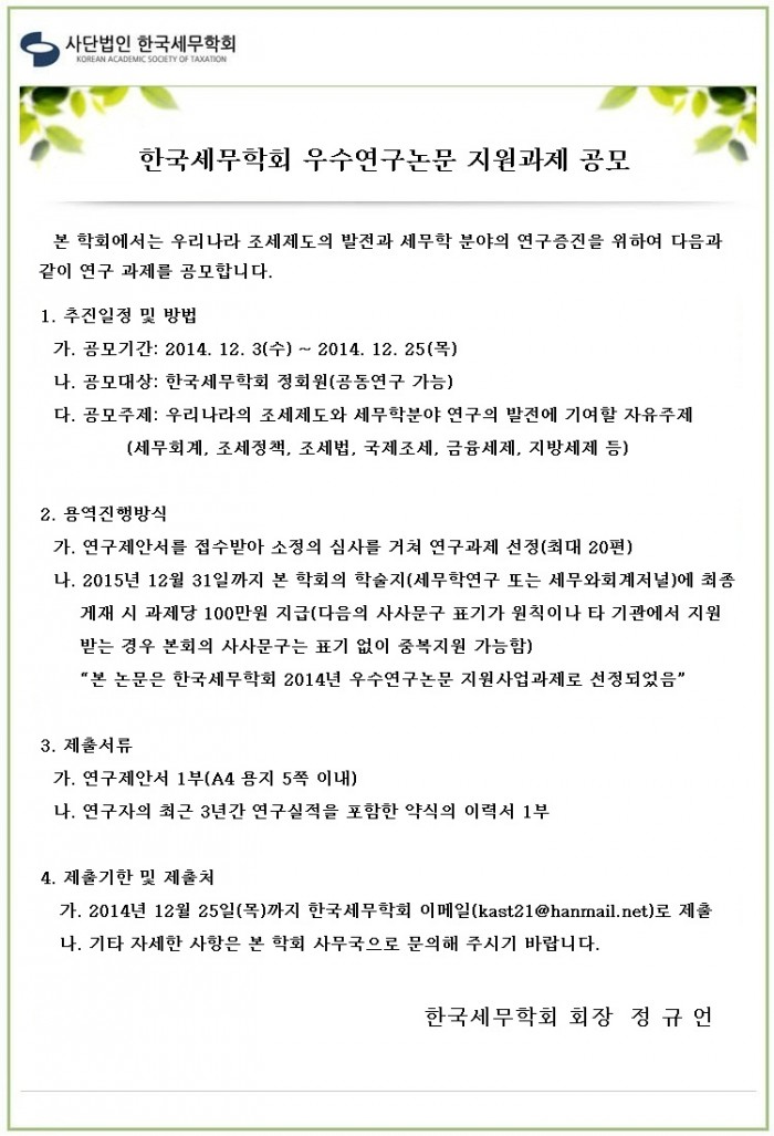 [한국세무학회]우수연구논문 지원과제 공모(~12/25)