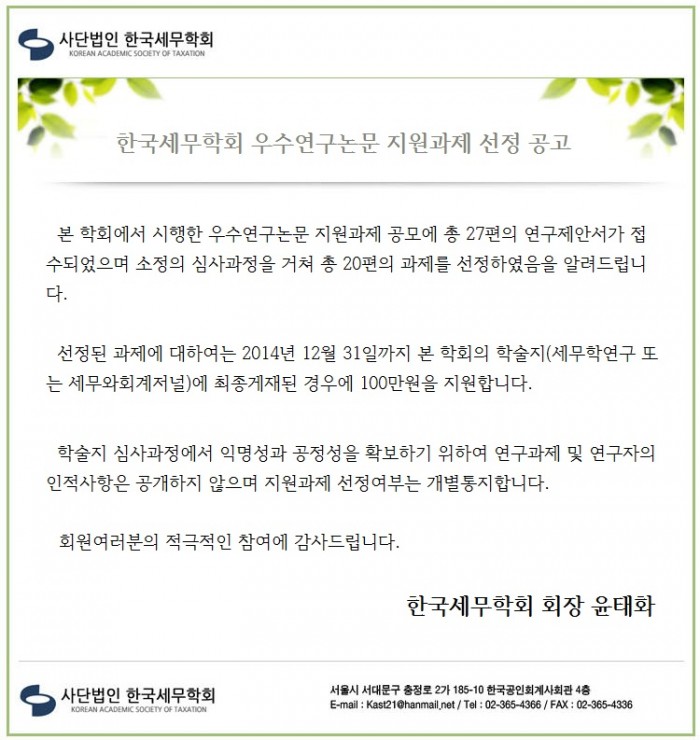 [한국세무학회]우수연구논문 지원과제 선정 공고