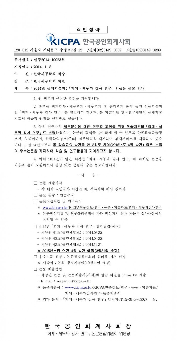 [KICPA]"회계ㆍ세무와 감사 연구" 논문 응모