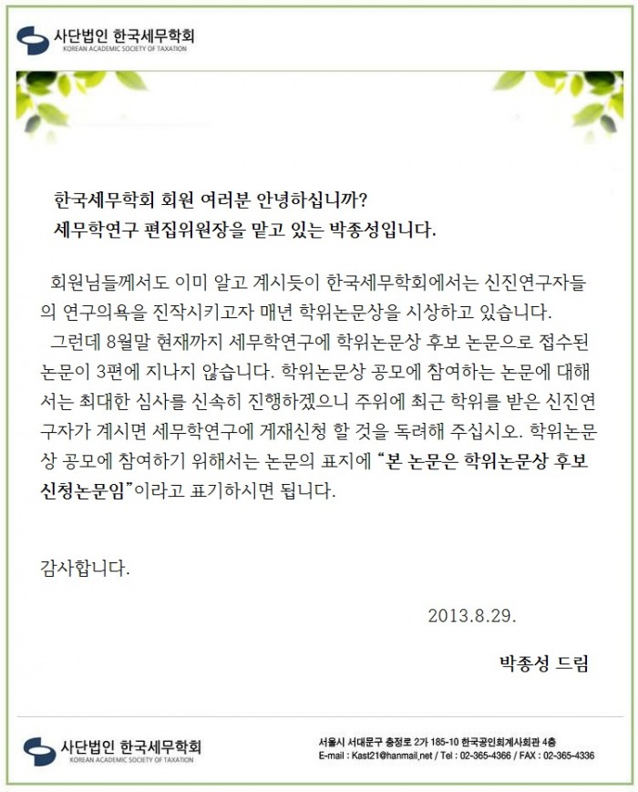 [한국세무학회]2013년도 세무학연구 학위논문상 논문 공모