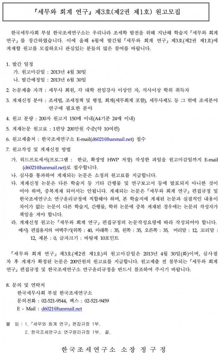 [공지][한국조세연구소]『세무와 회계 연구』제3호(제2권 제1호) 원고모집(편집규정, 윤리규정 파일 포함) (2013.4.30.까지) 한국세무학회 0 18,278 2013.04.11 10:21 첨부파일 - 첨부파일: (최종) 한국조세연구소 연구윤리규정.pdf (179.2K) 1 2013-04-11 10:21:13 - 첨부파일: 세무와 회계 연구 편집규정.pdf (375.4K) 0 2013-04-11 10:21:13 목록 본문