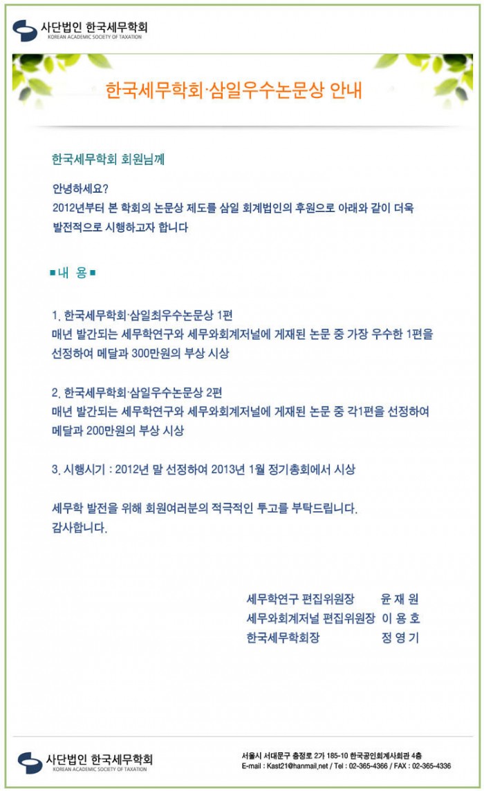 한국세무학회∙삼일 우수논문상 안내
