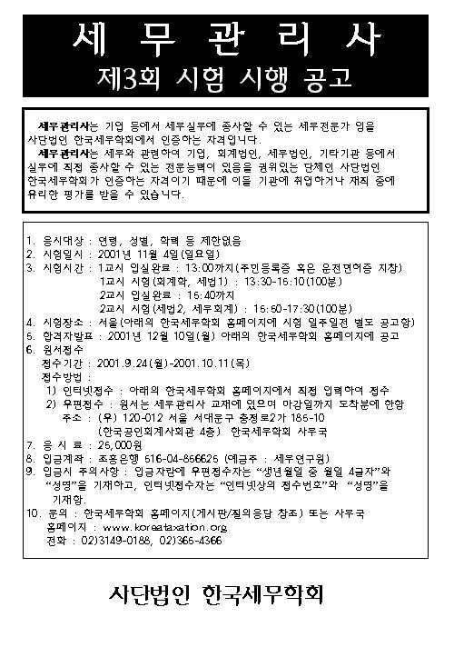 [일반]제3회 세무관리사시험 시행공고 한국세무학회 0 20,490 2006.07.02 06:52 첨부파일 - 첨부파일: 1000243729.jpg (89.6K) 96 2006-07-02 06:52:23 목록 본문 .