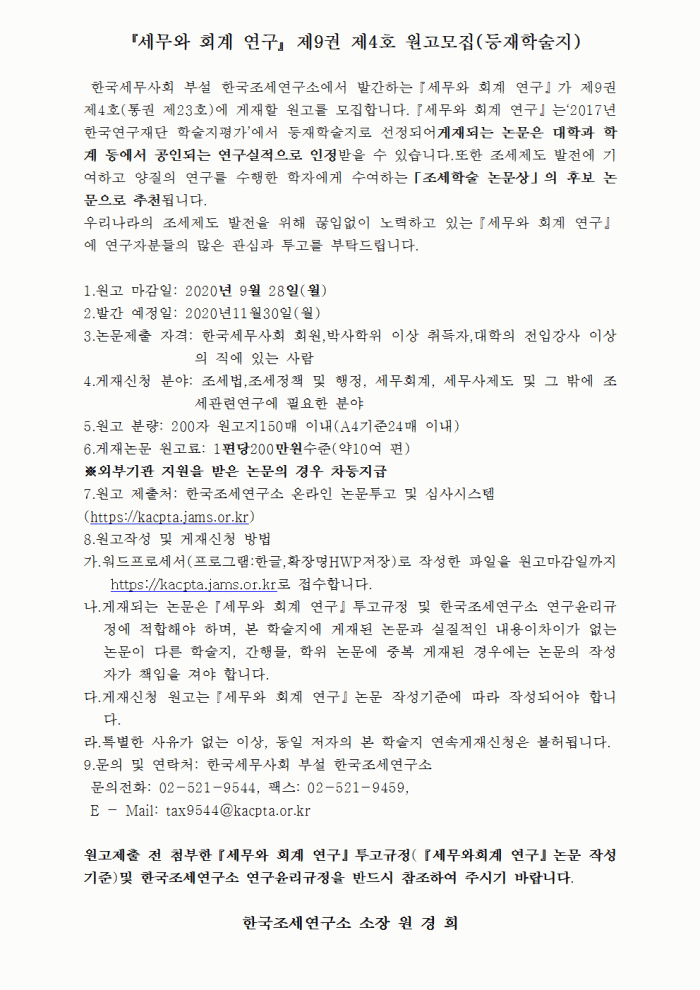 [공지][한국조세연구소]『세무와 회계 연구』 제9권 제4호 원고모집(등재학술지) 한국세무학회 0 8,624 2020.09.04 10:52 첨부파일 - 첨부파일: 한국조세연구소_투고규정.pdf (230.0K) 0 2020-09-04 10:52:57 - 첨부파일: 한국조세연구소_연구윤리규정.pdf (250.6K) 0 2020-09-04 10:52:57 목록 본문