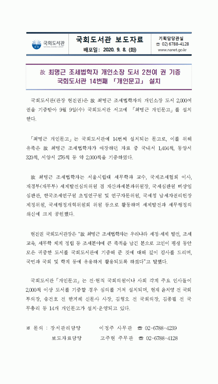 [공지][국회도서관 보도자료]故 최명근 조세법학자 개인소장 도서 2천여 권 기증 국회도서관 14번째 「개인문고」 설치 한국세무학회 0 5,886 2020.09.08 09:46 목록 본문