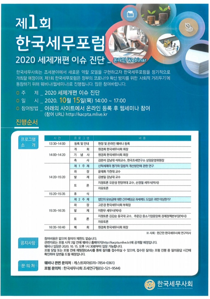 [공지][한국세무사회]제1회 한국세무포럼 개최안내(10/15, 온라인 웹세미나) 한국세무학회 0 9,263 2020.09.22 12:19 첨부파일 - 첨부파일: ### 포스터(제1회 한국세무포럼).pdf (864.9K) 0 2020-09-22 12:21:50 목록 본문