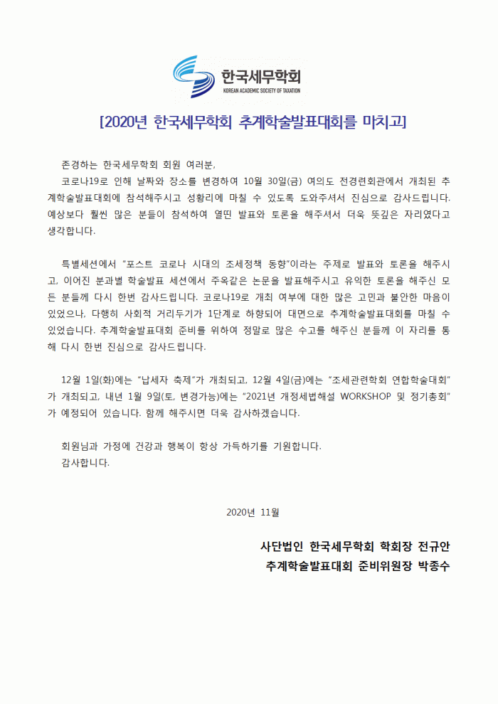 2020년 한국세무학회 추계학술발표대회를 마치고
