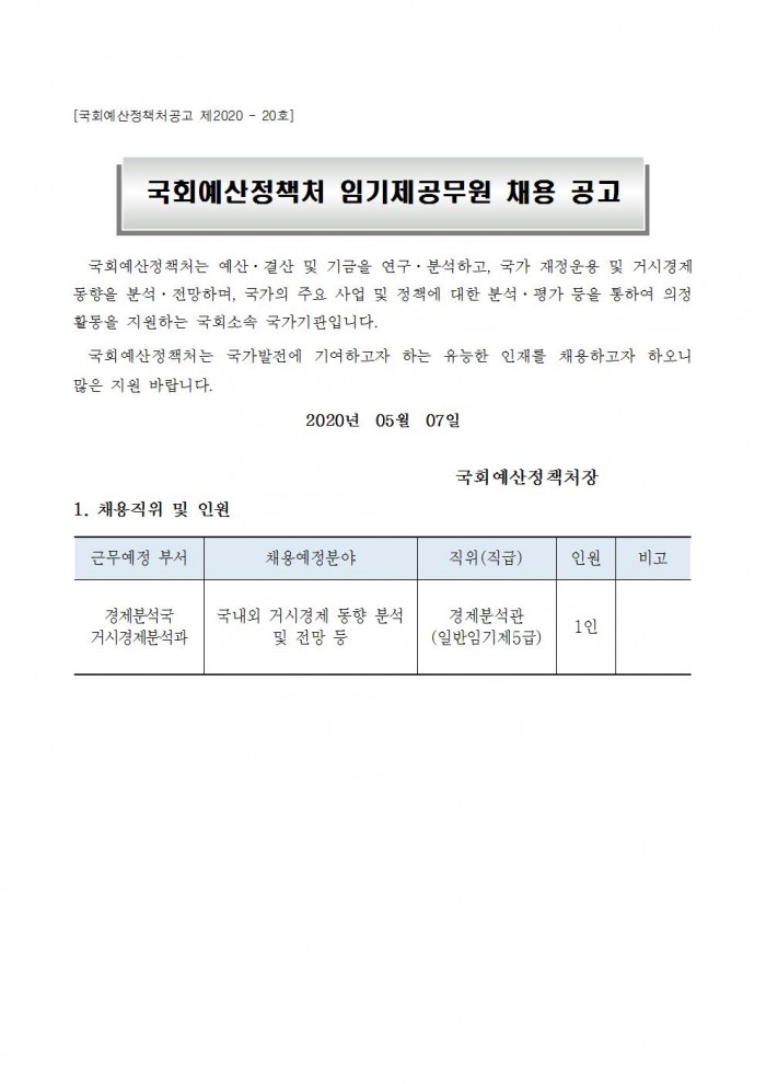 [공지][국회예산정책처] 임기제공무원 채용 공고(거시경제분석과) 한국세무학회 0 7,542 2020.05.08 14:13 첨부파일 - 첨부파일: 국회예산정책처 임기제공무원 채용 공고(거시경제분석과).hwp (44.5K) 0 2020-05-08 14:13:04 목록 본문