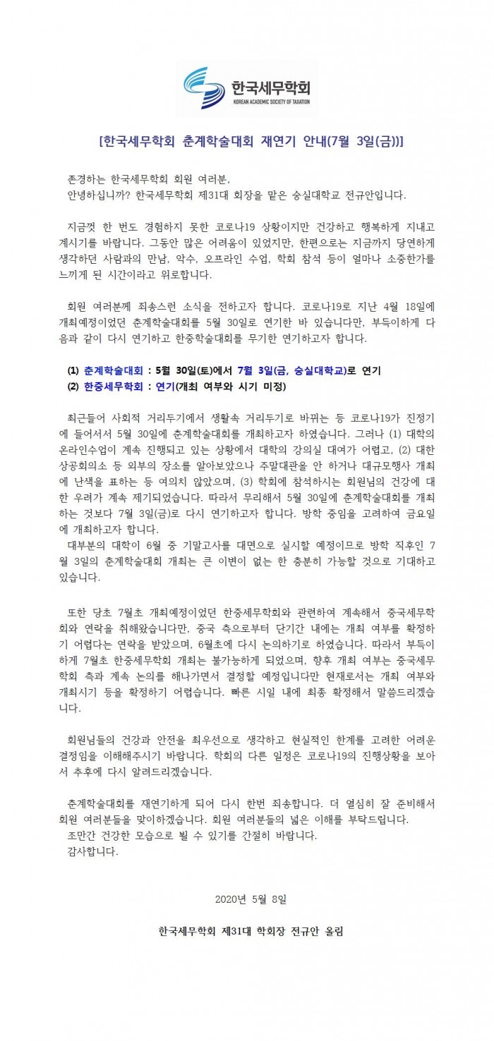 [한국세무학회] 춘계학술대회 재연기 안내(7월 3일(금))