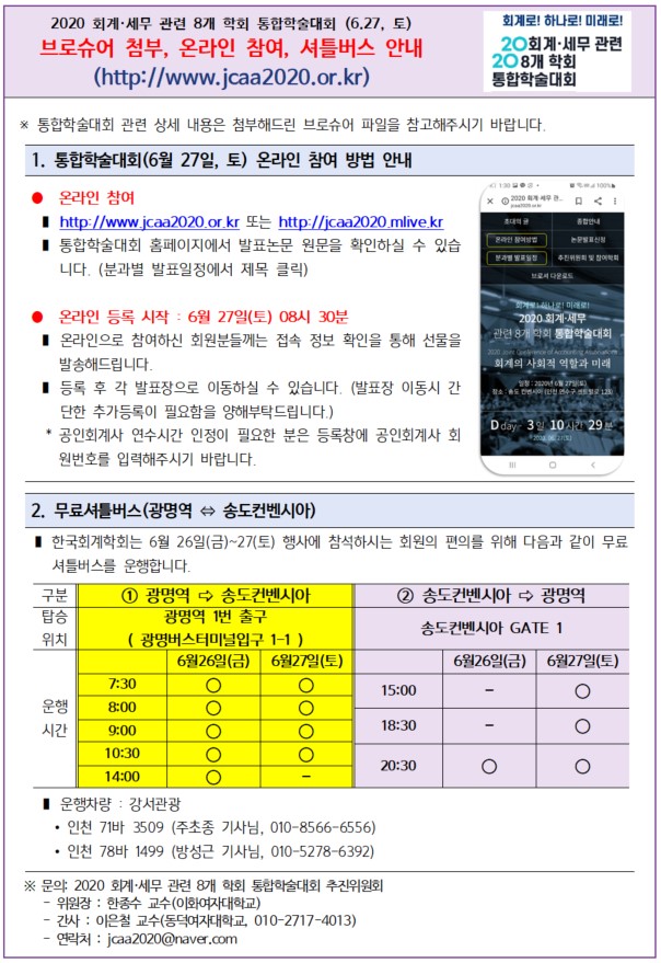 [공지][회계·세무 관련 8개 학회 통합학술대회]주요 내용 공지- (6.27, 토)_브로슈어첨부, 온라인참여, 셔틀버스안내 한국세무학회 0 7,488 2020.06.24 11:28 첨부파일 - 첨부파일: 회계·세무관련 8개학회 통합학회브로슈어.pdf (9.3M) 1 2020-06-24 11:28:18 목록 본문