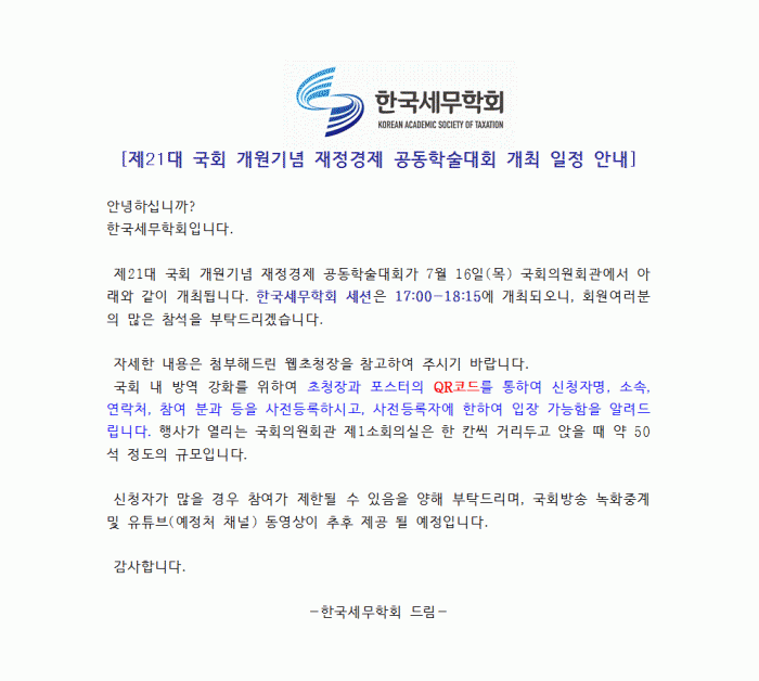[공지][한국세무학회] 제21대 국회 개원기념 재정경제 공동학술대회 개최(7/16,국회의원회관)-QR코드사전등록 한국세무학회 0 8,210 2020.07.10 10:14 첨부파일 - 첨부파일: 200716_예정처_21대국회~공동학술대회_웹초청장.pdf (1.6M) 1 2020-07-10 10:14:57 목록 본문