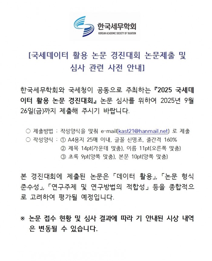 [공지][한국세무학회]국세데이터 활용 논문 경진대회 논문제출 및 심사 관련 사전 안내 한국세무학회_ 0 306 2025.09.11 11:02 첨부파일 - 첨부파일: 논문 심사 공지안_수정250911수정001.jpg (184.1K) 1 2025-09-11 11:02:11 목록 본문