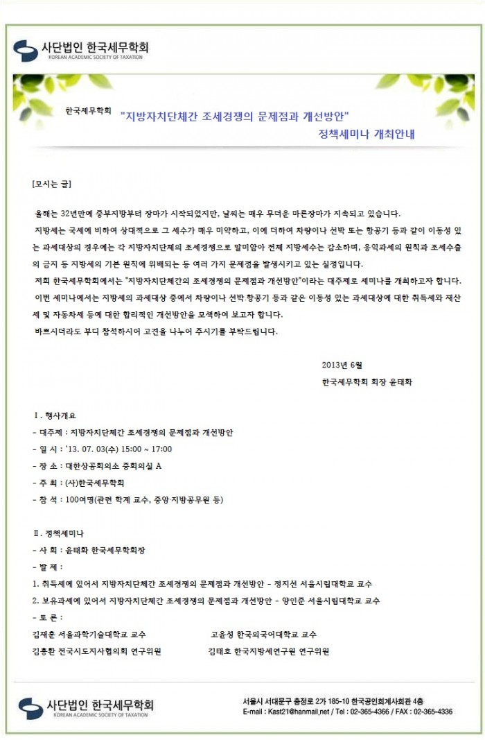 "지방자치단체간 조세경쟁의 문제점과 개선방안" 정책세미나 개최 안내