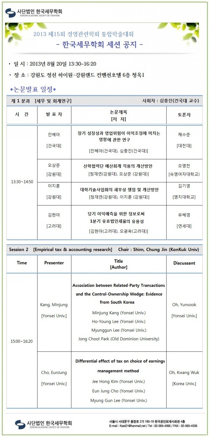 2013 제15회 경영관련학회 통합학술대회 한국세무학회 세션공지