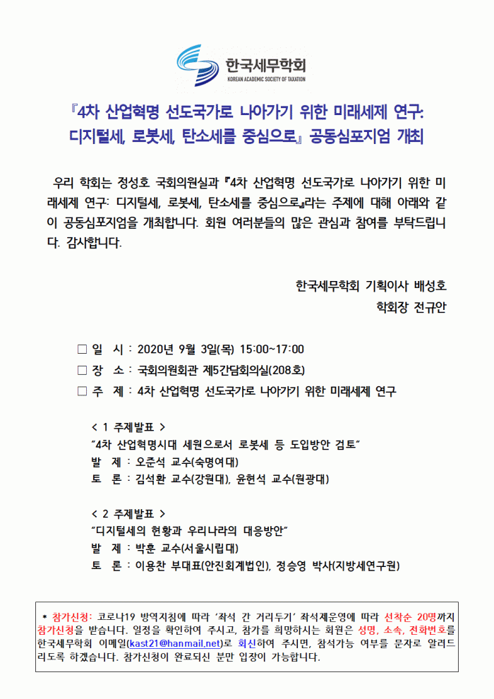 『4차 산업혁명 선도국가로 나아가기 위한 미래세제 연구: 디지털세, 로봇세, 탄소세를 중심으로』 공동심포지엄 개최 한국세무학회 0 3,998 2020.08.10 13:34 목록 본문