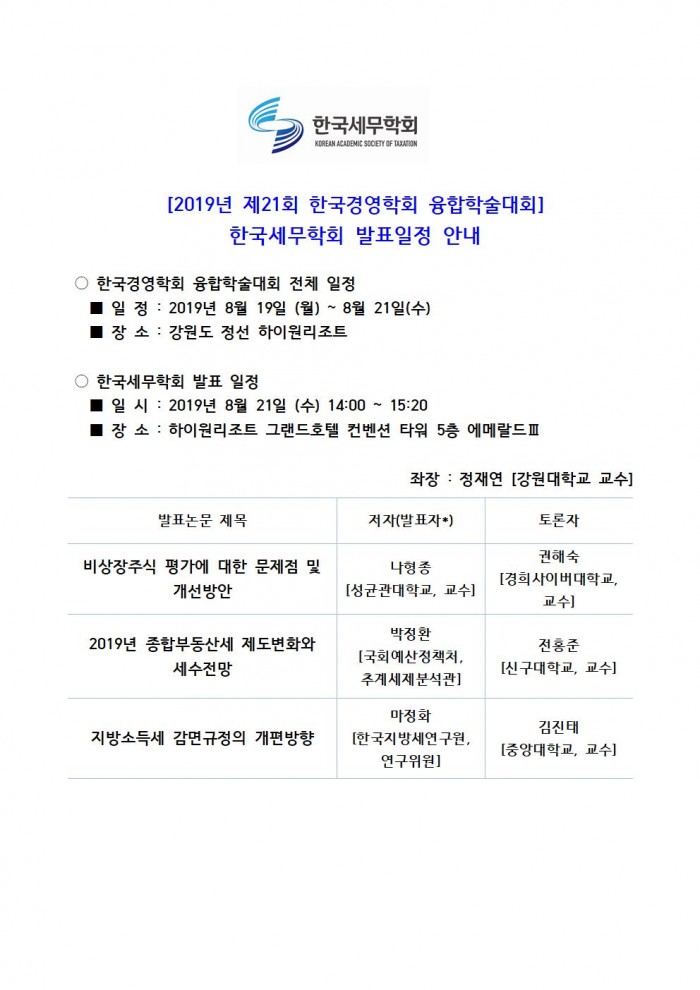 2019년 한국경영학회 융합학술대회 한국세무학회 발표일정 안내