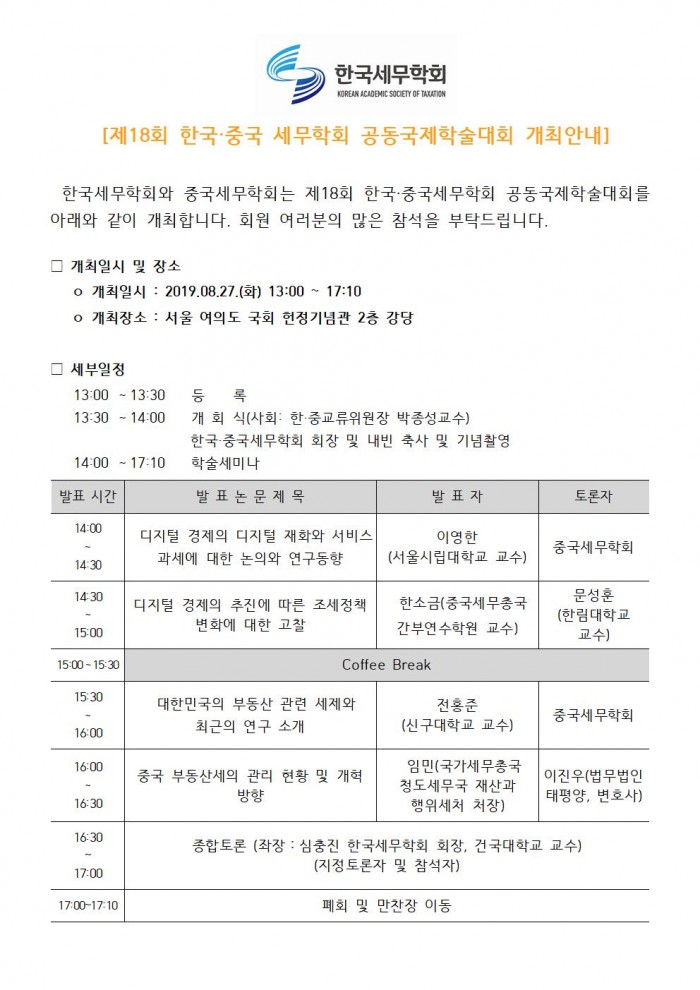 제18회 한국·중국 세무학회 공동국제학술대회 개최안내(8/27, 국회 헌정기념관) 한국세무학회 0 6,652 2019.07.22 10:14 첨부파일 - 첨부파일: 2019.제18회 국제학술대회 발표논문집 최종.pdf (4.0M) 4 2019-09-04 13:19:40 목록 본문