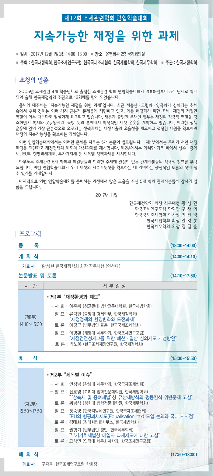 제12회 조세관련학회 연합학술대회(12/1, 은행회관) 한국세무학회 0 8,338 2017.11.21 10:43 첨부파일 - 첨부파일: 제12회_조세관련학회_연합학술대회_자료집.pdf (10.6M) 3 2017-12-04 10:51:21 목록 본문